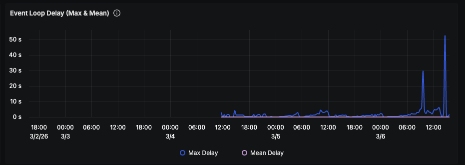 GC pauses grew with the heap. Toward the end of each cycle, event loop delay spiked to 50 seconds: