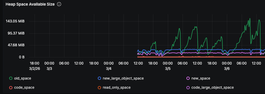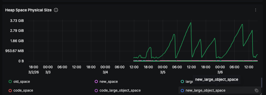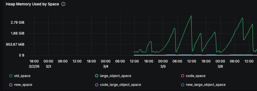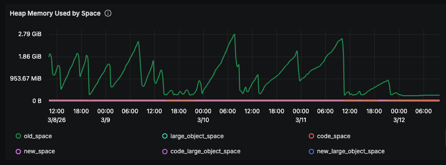 Compare the right side of the graph (after 3/11) to the left (before fixes). The repeated climb-and-crash cycles have stopped. Old-space is flat.