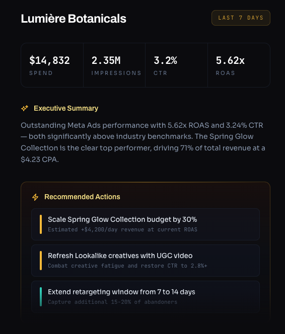 Powered by the latest AI model with real-time access to your campaign data. Upgrade anytime to get reports on a daily or weekly cadence.